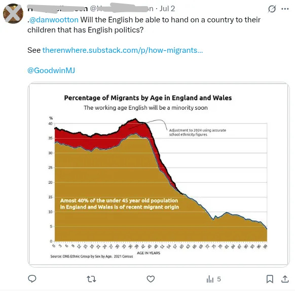 It is now the rule that discussion of the demographic replacement of the English people is flagged as ‘offensive’. Even discussing this is regarded as extremist and achieves a shadow ban.
